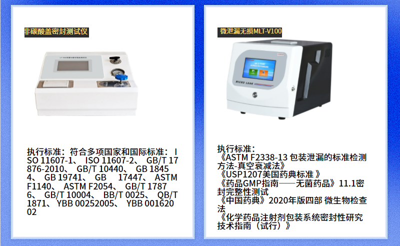 MLT-V100型微泄漏無損密封測試儀依據《ASTM F2338-2013包裝泄漏的標準檢測方法-真空衰減法》標準研發。 《ASTM F2338-13包裝泄漏的標準檢測方法-真空衰減法》 《USP1207美國藥典標準》 《藥品GMP指南